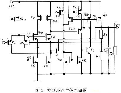 閉環控製係統的主體電路如圖2所示,VM1~VM8組成折疊式的誤差放大器,VM9~VM10組成單級的電流鏡作為負載,這樣做的好處就是采用10 pF左右的補償電容就可以使係統達到穩定。VM5~VM14和VQ組成級間緩衝級。R1和R2組成反饋網絡,其中
