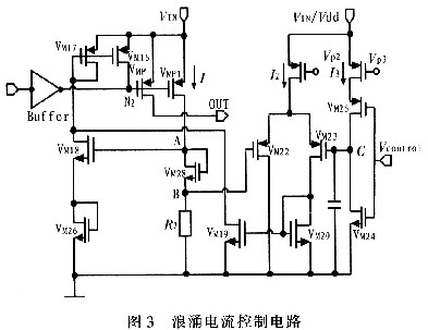 由上麵分析可知,由於N2節點電壓迅速變化,導致大的浪湧電流流過P功率管(VMP管)。因此隻需要控製N2jiediandianyadebianhuajiukeyishixiandianliudekongzhi,kongzhigailangyongdianliubianhuawufeijiushikongzhiqibianhuadexielvhefengzhi。qijutidedianluyuanlitubaokuolianggebufen,jilangyongdianliudexielvkongzhibufenhefengzhikongzhibufen。jutideshixiandianlurutu3所示。