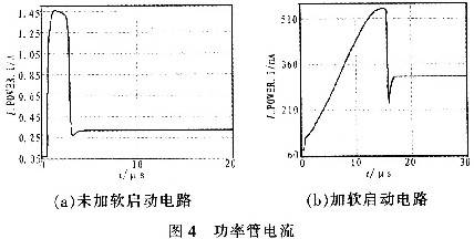 圖4為係統剛啟動時,流過功率管VMP管的電流,圖4(a)為沒有加軟啟動電路時,流過P功率管的瞬態電流,其峰值電流高達1.45 A。圖4(b)表明軟啟動電路分別從斜率和峰值成功地控製了瞬態電流,其峰值僅為520 mA,上升的斜率幾乎是一恒定值,不過這會增加係統的響應時間。因此可以根據應用係統的其他要求確定浪湧電流的斜率和峰值。