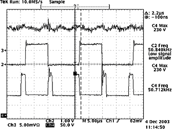 (b)圖中,示意了隔離變壓器副邊輸出的兩路驅動波形,可以直接驅動開關管。從圖中可以看出驅動波形比較理想:有快速的上升沿,並在一開始有一定的過衝,可以加速開通,減小了開通損耗;同時,有反偏截止電壓,提供了足夠的反相門極驅動,減小了下降時間;很好地驗證了驅動電路的設計是合理的。