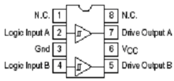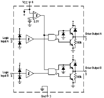 MC34152的外圍電路簡單,應用方便。它是8管腳的同相推挽驅動芯片,具體的內部結構和封裝如圖4所示。2,4腳為兩路控製信號輸入,經過芯片內部的推挽放大,直接輸出同相的兩路驅動信號(7,5腳)。為使芯片更加穩定地工作,一般在芯片的電源端並聯一個濾去高頻幹擾的瓷片電容和一個濾去低頻幹擾的電解電容。