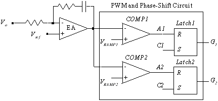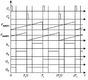 如圖3所示,時鍾信號C1和C2相差180度,它們分別對應的鋸 VRAMP1 和 VRAMP2 也相差180度,電壓誤差放大器的輸出信號 VEA、Vo 分別與 VRAMP1 和 VRAMP2 相比較,再通過兩個RS觸發器得到相差180度的驅動信號 G1 和 G2 。