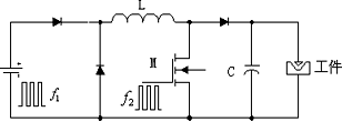 圖1為前、後級變換器的主電路圖。其中電容C的值很小,它的作用是高壓引弧放電。具體工作過程是這樣的:當開關S關斷時,由於工件還處於開路狀態,所以電感L中的大電流給C充電,致使工件兩端電壓線性急劇上升,直至高壓擊穿正常放電,此後,電流流經工件進行加工,一直延續到S開通時結束。假設前級變換器的開關頻率為f1,後級電子負載開關S的開關頻率為f2,那麼f1和f2有以下4種情況。