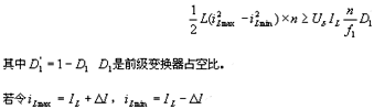 在t0時刻以前,S管開通,前級輸出短路,理想情況下,變壓器副邊輸出極窄的方波(Uo),當t0時刻S關斷時,電流iL經S換流至二極管D,給負載輸出電流。由於t0之前,前級變換器的占空比極小,突加負載後,由儲能電感給負載提供部分電流,隨著時間的延長,iL減小,受電流環的控製,前級變換器占空比增加,使iL回升至原值,故iLyouyigebodongguocheng。lingwai,ruguodianliuhuanshejimeiyoudadaozuiyoushi,namedianliuzaitiaojieguochengzhongdechaotiaoliangjianghenda,tiaojieshijianhenchang,zhishijiagongdianliubuwending,yingxiangjiagongxiaolvhejingdu。dancongS的一個開關周期看來,由於f1》f2,S的一個周期中,前級變換器將要經曆多個周期,即當S關斷時,前級變換器有足夠多的周期可以調節iL,使得iL穩定。假設iL的允許波動範圍為ILmin~ILmax,並假設f1在S關斷後經過n個周期,進入穩定狀態,從能量的角度來看,即要保證在這n個周期中,當前級變換器無輸出時,電感的儲能要滿足負載能量需求,這可用式(1)表示。