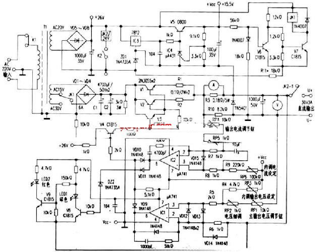 繼電器JK1、V6、V7等電路組成交流輸入電壓自動切換電路,由輸出電壓來控製。當輸出電壓在12V以下時,JK1常閉觸點接通,輸人電壓在交流15V繞組工作;當輸出電壓上調到直流13.5V以上時,繼電器JK1吸合,常開觸點接通,交流輸入電壓在30v繞組7-作zuo。以yi保bao證zheng輸shu入ru輸shu出chu電dian壓ya在zai正zheng常chang的de壓ya差cha範fan圍wei內nei,以yi降jiang低di調tiao整zheng管guan的de功gong耗hao。高gao檔dang的de電dian源yuan一yi般ban設she計ji有you三san組zu繞rao組zu工gong作zuo。進jin一yi步bu降jiang低di穩wen壓ya管guan的de無wu用yong功gong耗hao。其qi中zhong電dian阻zuR11*為調整電阻,適當調節以適合的輸出電壓切換點。因電路具有遲滯特性,不會在切換電壓點造成繼電器的反複吸合、釋放而產生振蕩的不穩的現象。繼電器JK2與K2為輸出電壓控製開關,在調整輸出電壓時,若需要關閉輸出電壓時,可按動K2,而不必拆下輸出電壓端子,方便操作。輸出電壓指示直接接在輸出電壓端,電流表接在電流取樣電阻R3(O.18Ω/SW)上,采用3位半的數字表頭,可精確地顯示電流電壓。
