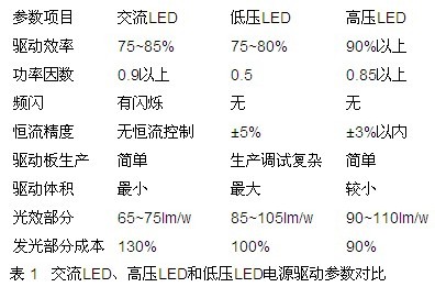 低壓LED驅qu動dong電dian源yuan是shi從cong開kai光guang電dian源yuan原yuan邊bian反fan饋kui電dian路lu移yi植zhi過guo來lai的de產chan物wu,設she計ji電dian路lu複fu雜za,恒heng流liu精jing度du誤wu差cha較jiao大da。小xiao功gong率lv開kai關guan電dian源yuan驅qu動dong方fang式shi驅qu動dong效xiao率lv充chong其qi量liang設she計ji到dao80%,LED應用開始要求功率因數,小功率電源並不具備。器件壽命受到限製,內置電源體積也受限,市場機會因此受到局限。 高壓LED是因上述問題而誕生的產物,集交流LED和低壓LED之優點,驅動效率及恒流精度大大提升,各項參數均優秀,性能價格比高。
