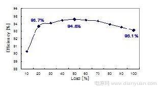 轉換器的效率如圖 7 所示,在額定負載為 20%、50% 和 100% 的情況下測得的效率分別為93.7%、94.6% 和 93.1%,這顯示了邊際性能,因而使用設計優良的 PFC 和 DC-DC 級能夠達到85 PLUS 規範要求。