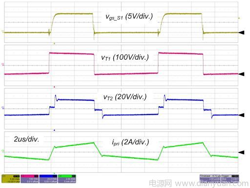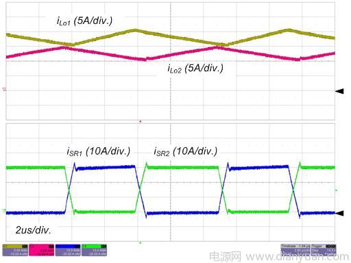 圖 4 和圖 5 所示為轉換器在標稱輸入和全負載情況下的實驗波形。S1 的柵極信號,主變壓器的初級端和次級端的電壓和初級端電流如圖4所示。請留意這些波形與理論分析很好地吻合,包括ZVS 運作。輸出電感電流和 SR 的電流如圖 5 所示,由於占空比和寄生組件,輸出電感電流是不均衡的,這意味著平均勵磁電流小於中心抽頭式配置(注 1)。