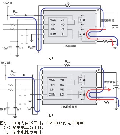 MOSFET逆變器的另一個優點是圖4(e)所示的自舉電壓(陰極輸出電壓)。從圖4(e)可以看出,電機的工作頻率為10Hz。圖中畫出了自舉電壓和逆變器輸出電流。當電流為正時,自舉電壓VBS維持在VCC=15V附近,但當電流為負時,VBS就下降到接近10V。這是由於不同電流方向采用不同的充電機製所造成 (參見圖5)。當輸出電流為正時,電流要麼流經高壓側MOSFET,要麼流經低壓側體二極管。在這種情況下,當低壓側體二極管導通時,將對自舉電容CBS充電 (參見圖5(a))。此時,對CBS的充電電壓可由公式(2)表示。