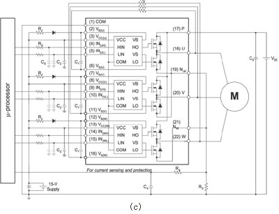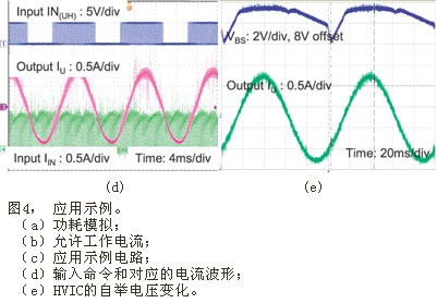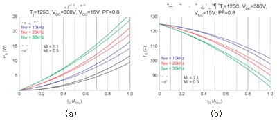 圖4給出了本模塊的一個應用示例。在圖4(a)和(b) 的模擬中,假設結區溫度Tj保持為125℃;該溫度為本模塊的最大工作結區溫度。通過這項模擬,肯定當模塊外殼溫度控製在100℃並采用空間向量調製 (SVPWM) 時,輸出功率可大於Pout=100W,並允許Pd=16W的功率損耗。根據這些信息,我們利用一台130W BLDC電機(正弦反電動勢) 和圖4(c)所示的電路,對模塊的額定功率進行驗證實驗。實驗中采用的散熱片有效表麵積約為100cm2。采用該散熱片後,模塊在20kHz SVPWM下可向電機輸出150W的功率;熱功耗為12W。而此時模塊的外殼溫度為86℃,MOSFET結區溫度為104℃,環境溫度27℃。在同樣條件下采用圖4(d)所示的非連續PWM時,由於有效開關頻率降低,模塊的功耗可達到8W,而逆變器效率可達到95%。此時,模塊的外殼溫度為62℃,結區溫度為82℃(已考慮電機鐵芯的損耗),逆變器的損耗為整個係統功耗的27%