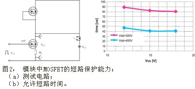 MOSFET的另一個優勢是其耐用強度。它比IGBT的耐用強度高;與額定功率相同的其它器件相比,具有更寬的安全運行區 (SOA)。本文所介紹逆變模塊中的MOSFET在典型的運行條件 (Vcc=15V, Vdc="300V", Tc="25"℃) 下,都能承受80ms的短路電流 (見圖2)。而且,在出現電湧時,基於MOSFET逆變器的抵禦能力優於額定電壓相同的IGBT方案,這已被開關器件的雪崩額定電壓值所證實。因此,在220V下可采用額定電壓為500V的MOSFET,而在相同條件下采用IGBT,其額定電壓則需要達到600V。但是,傳統的MOSFET開關速度極高。MOSFET通常用於快速開關轉換器,如AC/DC或DC/DC電源,這些應用場合要求柵極電荷Qg盡可能少,以降低開關損耗。不過,在電機驅動應用中,這種快速特性沒有用處,尤其是高的dV/dt值還會引起電磁幹擾。穩定性與最佳性能不易兼顧.