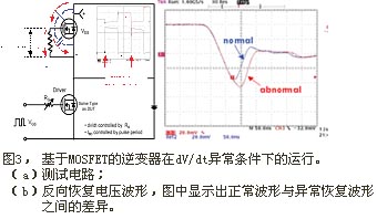 通常,增加柵極阻抗會降低MOSFET的開關速度。在如圖3(a)所示的半橋電路中,如果高壓側MOSFET的柵極阻抗 (在HVIC中實現) 大,將會存在一定的短路電流;這個電流是上麵那個MOSFET導通時的密勒電容Cgd感應產生的,不嚴重時一般不會察覺。但是,正如圖3(b)所示,這種異常行為會增加逆變開關的損耗 (導通損耗),並最終減弱係統的額定功率和穩定性。在這樣的瞬態過程中,要降低開關速度,同時又不失穩定性,上方那個MOSFET的Vgs應小於閾值電壓Vth。換句話說,最好通過調節HVIC的關斷阻抗來保證係統的穩定性,防止因電壓變化而感應短路電流。但這會增加MOSFET的關斷dV/dt值。