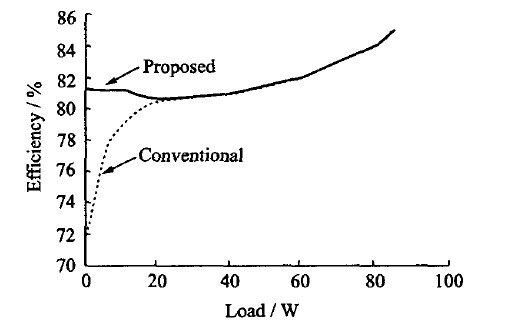 圖14給出了集成了該低功耗電源係統的綠色多模式反激式控製器的效率圖(工作頻率為40~130kHz),並與傳統的反激變換器效率進行了比較。由圖可知,采用多模式反激式控製降低了芯片的輕載功耗,提高了效率。
