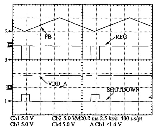 係統的多模式控製測試結果見圖13。中載或重載下係統采用PWM 模式工作,許多單元的供電電源為REG=5 V.極輕載條件下則關斷5 V的供電電源,減小係統的待機功耗,同時也有利於減小EMI和噪聲。其過程如下:當FB電壓低於一個閾值時,待機模式選擇,則SHUTDOWN信號變高,關斷5 V 電壓源REG模塊,同時VDD-AD繼續給芯片供電,保證在輕載時芯片的檢測能夠連續實現。