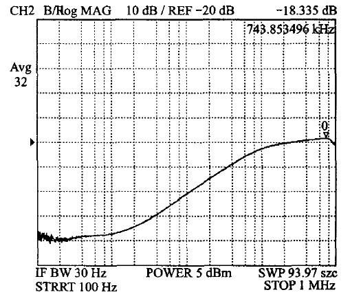 5 V 電壓的PSR測試波形如圖10所示。由此圖可見,其PSR可以達到-60 dB.該供電模塊在工作頻率為40~130 kHz的綠色多模式反激式控製器中的應用表明,它對來自電源的幹擾具有較好的抑製能力。