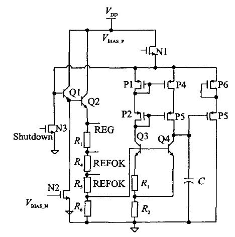 圖5為5 V穩定電壓源(REG)的電路原理。其中P1、P2、P3、P4組成共源共柵結構,可以提高電流鏡的鏡像精度,同時提高電源抑製比。Q3、Q4、R 1、R2組成一個帶隙基準電壓,這樣可以減小額外的電流支路,降低功耗。Q1、Q2組成達林頓結構,增加輸出能力。P5、P6增加匹配,減小溝道長度調製效應。Q1、Q2、R3、R4、R5、R6、Q4、P5、P6組成一個負反饋環路,將REG電壓穩定在5 V。圖中C具有兩種作用:1、記憶直流工作點;2、補償環路電容。