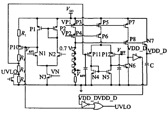 電路的工作原理可簡述如下:12 V供電電壓可在VDD比較低時建立一個PTAT (ProportiONal toabsolute temperature)電流源,然後利用其建立起帶隙基準電壓源;當VDD由0上升時,帶隙基準電壓r首先建立,此時兩個比較器的輸出為低電位,P1導通,輸出為高電位;當K1VDD大於 r時,COMP1輸出跳變,N1管導通,鎖存器鎖存上一個信號,UVLO為高電位(注意其為低電位有效);當K2VDD大於VREF 時,N2導通,則UVLO-out為低電位,使能其他模塊;隨著VDD減小,K2VDD首先小於VREF,N2關斷,則鎖存器鎖存信號,UVLO-out保持;當 VDD減小到K1 VDD小於VREF時COMP1跳變,P1導通,N1關斷,則輸出UVLO-out為高電位,關斷整個控製芯片。