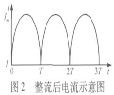 在開關電源中, 工頻交流電流經過整流橋後, 不再是單一頻率點的交流電流, 而是單向的脈動直流電流,其波形如圖2所示, 利用傅裏葉變換可得: