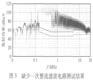 缺少一次整流濾波電路的測試結果如圖3所示,從圖3可以看出, 這個超標的頻率點不是單一的而是覆蓋了整個頻段。為了濾除這些幹擾, 將電流的畸變減小到最小, 就需要在整流過後增加一級濾波電路。