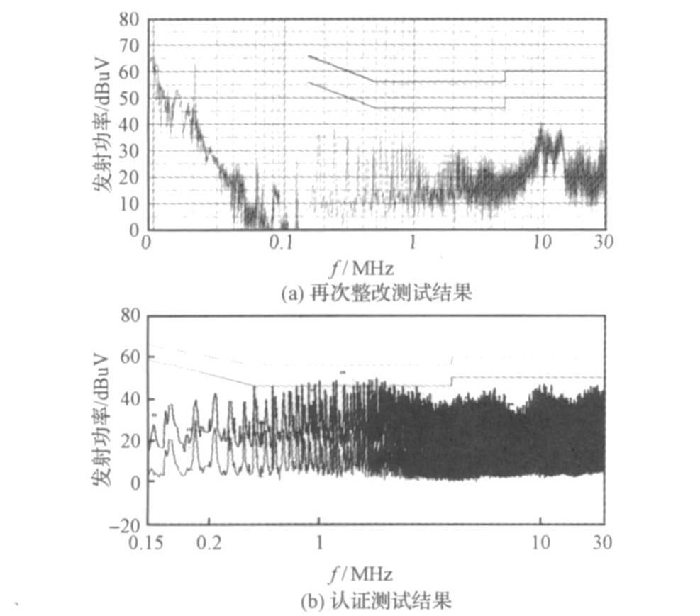 從圖6測試的結果分析可知, 在2MHz附近幹擾信號幅值相對原先的最大降幅為5 dBuV, 但是在0. 8MHz~1MH z頻率領域幹擾幅度有所增加, 峰值較為靠近標準限值。雖然預測試的結果已經低於標準限值, 但是為了能一次性通過認證就必須留出餘量。再次改進具體措施為: