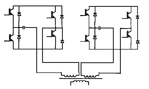 當負載電容容量小且重複頻率高時, 一種設計思想是改進控製電路, 使其達到的效果相當於: 在每一個充電周期開始階段, 使用諧振電流大的主電源快速充電至預設電壓, 隨後轉為小電流電源充電, 在T w 階段向負載提供很小的電量以減小波動; 另一種技術路線采用雙橋路的移相控製電路, 如圖7 所示,這種電路非常適合大功率充電的應用場合。EM I 公司的30kJ/s , 50kV 電源采用了此項技術。