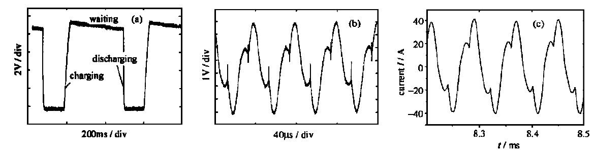 圖6 是某調製器充電電源波形圖, 該電源充電功率可達2kJ/s , 工作頻率12. 5kHz, 電壓30kV.測量用的示波器型號為泰克TDS3032.V s= 500V , C r= 0. 4uF,L r= 158uH, T s= 80us, 變壓器副邊為雙繞組,每繞組升壓比1∶40, Cload= 0. 66uF.實際電路中L r 完全利用了變壓器的漏感, 且漏感選擇較大以減小分布電容。圖6 (c) 是該電源諧振開關電流的仿真波形, 和實測波形比, 吻合得很好。