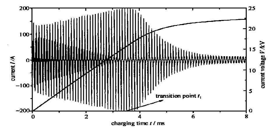 忽略回路電阻, 電路的特征阻抗為Z =√ L/C , 諧振周期為T r = 2π √L/C , 其中C 是諧振電容C r 和折合到原邊的負載等效電容C''串聯後形成的總電容, 通常因高壓變壓器變比高, 等效電容C ''和C r相比較大, 因此串聯後的總電容C 和C r 相差不大。完整的充電電流波形包絡及充電電壓如圖4 所示, 其中t1是轉折點, t1 以前是線性等台階充電, t1 以前電流波形放大如圖5 (a) 所示, 轉折點附近的電流波形如圖5(b) 所示。