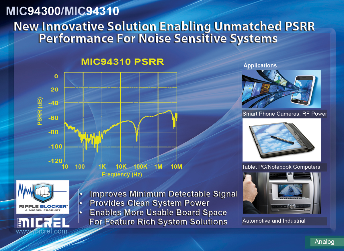 模擬、高帶寬通信及以太網集成電路(IC)解決方案領域的行業領導者麥瑞半導體(Micrel Inc.)近日發布了Ripple Blocker係列IC,包括MIC94300電壓跟隨輸出IC和MIC94310固定輸出(LDO)IC。