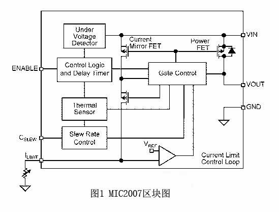 圖1展示了MicrEL公司MIC2007型限流配電開關圖例。