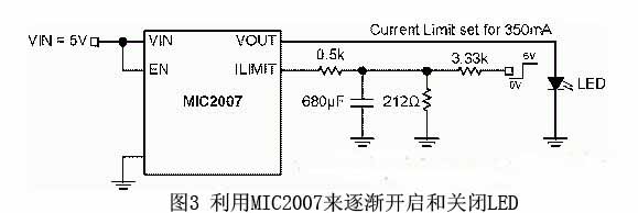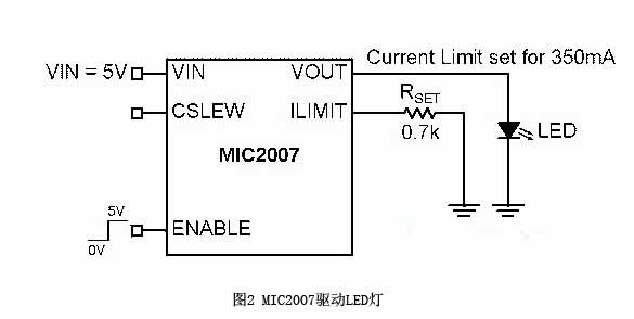 圖2展示的是輸出和LED相連的配電開關。MIC2007可以在2.5V-5.5V的輸入電壓下工作。它是通過外置電阻器Rset來設定限流值的。限流值等於CLF/Rset,CLF為限流因數,一般是245(請參考MIC2007數據表暨電氣性能表),而Rset 則等於0.7 kΩ。因此,限流值就是245/0.7 kΩ = 350 mA。