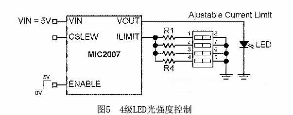 MIC2007可以在開關開啟且LED已點亮之後調節限流值。而通過改變限流值,就可以動態調節LED的光強度。如圖5所示,有4個電阻器連接到Ilimit管腳。