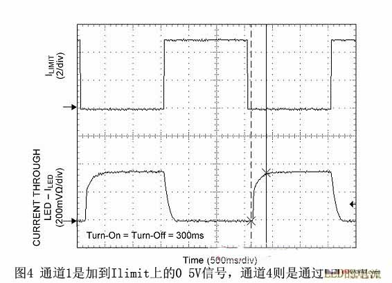 圖4中通道1是加到Ilimit上的0 5 V信號,而通道4則是通過LED的電流(Iled; 開啟時間= 關閉時間= 300 ms)。