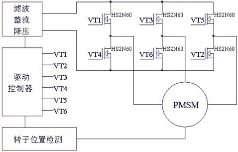 方案中無刷直流電機(BLDCM)輸入(110V/220V)交流電,經轉換器(converter)轉成直流,要轉入電機線圈前須先將直流電壓由換流器(inverter)轉成3相電壓來驅動電機。換流器(inverter)由6個功率MOSFET(VT1~VT6)分為上臂(VT1、VT3、VT5)/下臂(VT2、VT4、VT6)連接電機作為控製流經電機線圈的開關。MCU提供PWM(脈衝寬度調製)決定功率MOSFET HS2N60IB開關頻度及換流器(inverter)換相的時機。