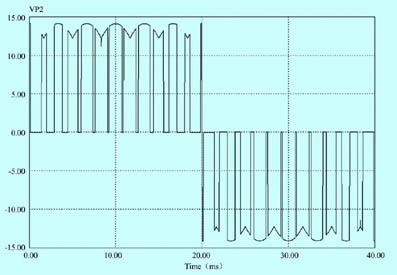 對虛擬整流波形進行斬波控製,便可以得到占空比可任意調節的PWM波形。如圖7所示,是通過SPWM控製得到的輸出波形圖。可以看出它的包絡就是虛擬整流得到的波形。