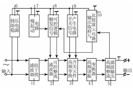 如圖1所示,它由抗幹擾濾波器1、可控整流濾波器2、高頻變換開關元件3、高頻諧振變換器4、高頻整流濾波輸出5依次連接而成。可控整流濾波器2的導通角的控製由觸發信號控製邏輯8完成。慢起動電路7使觸發信號控製邏輯8在開機時的導通角由零度逐步上升。輸出取樣與比較放大電路10,將高頻整流濾波輸出5的輸出電壓與基準電壓源相比較且進行放大,從而控製觸發信號控製邏輯8,使輸出電壓穩定。改變基準電壓源的大小,就能改變觸發信號控製邏輯8的觸發導通角,從而調節輸出電壓的大小。開關信號產生電路9產生一個適合高頻諧振變換器4的方波信號,用來控製高頻變換開關元件3的導通和截止,使直流電能進入高頻諧振變換器4,形成高頻電流震蕩;並經高頻變壓器輸出至高頻整流濾波輸出5,減小了開關噪聲。輔助穩壓電源6給慢起動電路7、觸發信號控製邏輯8、開關信號產生電路9、輸出取樣與比較放大電路10提供能量和基準電。