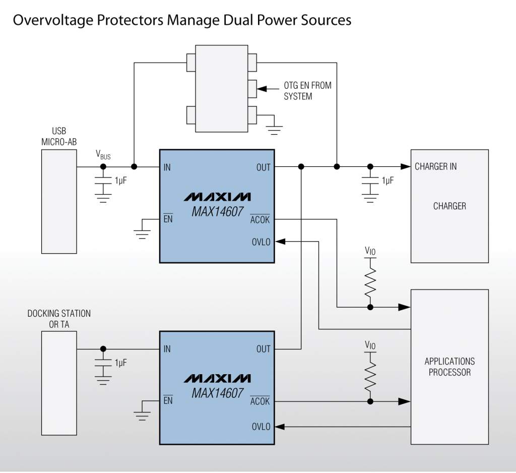 Maxim的過壓保護器采用反向偏置電路保護多電源供電便攜設備