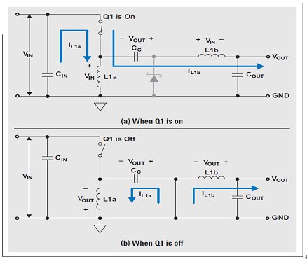 Q1 關閉時,L1b 的電壓必須為 VOUT,因為其與 COUT 並聯。由於 COUT 被充電至 VOUT,因此 Q1 關閉時 Q1 的電壓為 VIN + VOUT;這樣一來, L1a 的電壓便為相對於 Q1 漏極的 –VOUT。Q1 開啟時,充電至 VOUT 的電容 CC 與 L1b 串聯;因此 L1b 的電壓為 +VIN,而二極管 D1 的電壓則為 VIN + VOUT。