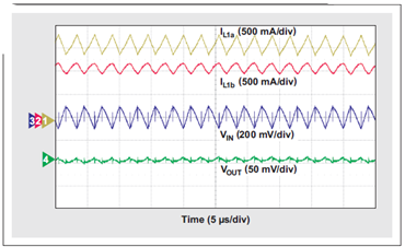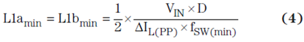 在(zai)理(li)想(xiang)緊(jin)密(mi)型(xing)耦(ou)合(he)電(dian)感(gan)中(zhong),每(mei)個(ge)電(dian)感(gan)的(de)單(dan)芯(xin)上(shang)都(dou)有(you)相(xiang)同(tong)的(de)繞(rao)組(zu)數(shu),這(zhe)時(shi)耦(ou)合(he)迫(po)使(shi)紋(wen)波(bo)電(dian)流(liu)在(zai)兩(liang)個(ge)耦(ou)合(he)電(dian)感(gan)之(zhi)間(jian)等(deng)分(fen)。在(zai)現(xian)實(shi)耦(ou)合(he)電(dian)感(gan)中(zhong),電(dian)感(gan)並(bing)沒(mei)有(you)相(xiang)等(deng)的(de)電(dian)感(gan),並(bing)且(qie)紋(wen)波(bo)電(dian)流(liu)也(ye)不(bu)會(hui)完(wan)全(quan)相(xiang)等(deng)。無(wu)論(lun)如(ru)何(he),在(zai)理(li)想(xiang)紋(wen)波(bo)電(dian)流(liu)值(zhi)的(de)情(qing)況(kuang)下(xia),如(ru)果(guo)存(cun)在(zai)兩(liang)個(ge)單(dan)獨(du)的(de)電(dian)感(gan),則(ze)我(wo)們(men)將(jiang)耦(ou)合(he)電(dian)感(gan)中(zhong)要(yao)求(qiu)的(de)電(dian)感(gan)估(gu)算(suan)為(wei)實(shi)際(ji)需(xu)要(yao)的(de)一(yi)半(ban),如(ru)方(fang)程(cheng)式(shi) 4 所示: