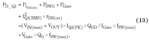 在相關環境溫度下,FET 功耗額定值必須大於傳導損耗(FET rDS(on) 的函數)和開關損耗(FET 柵極電荷的函數)的和,計算方法如方程式 13 所示: