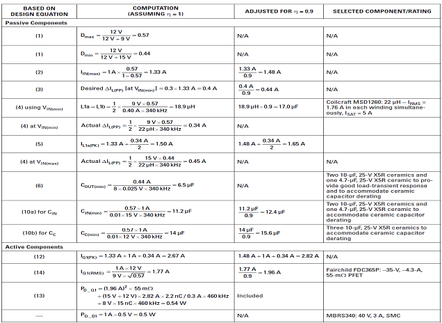 就本例而言,諸多要求都是針對一個 η= 0.9 峰值效率的 12-V、1-W 電源。負載為穩態,因此幾乎看不到負載瞬態。2-A 輸入電源為 9 到 15V。我們選擇了異步電壓模式控製器即 TI TPS40200,其工作在 340 和 460kHz 之間的開關頻率下。輸入端和快速電容器的最大允許紋波分別為彼此交叉最大電壓的 1%。最大輸出紋波為 25 mV,而最大環境溫度為 55ºC。由於 EMI 並不是問題,通過使用最小輸入電壓,我們選擇了具有更低電感值的電感。下一頁的表 1 概括了前麵介紹的一些設計計算方法。我們忽略了方程式 7 到 9 以及方程式 11,因為使用了高 RMS 電流額定值的低 ESR 陶瓷電容。