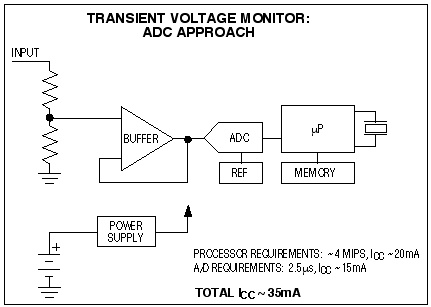 如果軟件比較具有高效編碼並且ADC無需處理器幹預,係統每次采樣可執行少於10條指令,這就要求處理器具有4MIPS的能力。這種執行能力並不適合采用電池供電(圖1)。需要考慮用模擬方法對輸入瞬態偏離進行響應,用以替代連續跟蹤方案。