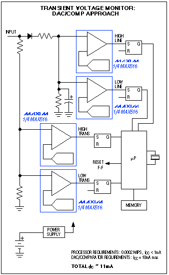 在這種情況下,DAC/比較器替代方案提供了幾個明顯優勢。需要4個DAC和4個比較器(或一片MAX516),後麵連接一個4路設置/複位觸發器。一組DAC/比較器/FF監測高瞬態電壓,一組監測低瞬態電壓,一組用於監測電網跌落,一組用於監測浪湧(圖2)。瞬(shun)態(tai)電(dian)壓(ya)直(zhi)接(jie)耦(ou)合(he)到(dao)比(bi)較(jiao)器(qi),連(lian)接(jie)到(dao)電(dian)壓(ya)跌(die)落(luo)和(he)浪(lang)湧(yong)監(jian)測(ce)比(bi)較(jiao)器(qi)的(de)輸(shu)入(ru)首(shou)先(xian)要(yao)進(jin)行(xing)整(zheng)流(liu)和(he)濾(lv)波(bo),以(yi)獲(huo)得(de)電(dian)網(wang)電(dian)壓(ya)的(de)平(ping)均(jun)值(zhi)。可(ke)在(zai)軟(ruan)件(jian)中(zhong)調(tiao)整(zheng)到(dao)合(he)適(shi)的(de)rms.