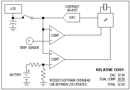 另外一種方法就是用一個低成本雙路DAC替代現有單路DAC.雙路DAC中的一路用於產生LCD對比度電壓,另一路用於構成ADC.無論單路還是雙路,都需要DAC和比較器支持快速、驅動DAC的簡單程序,以及對比較器采樣來實現逐次逼近(參見sidebar,逐次逼近)。