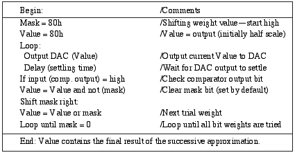 在逐次逼近ADC中,內部DAC的位模擬係列二進製重量,比較器輸出模擬天平指示。驅動權位處理的邏輯保存在封裝好的ADC的逐次逼近寄存器(SAR)或者控製DAC/比較器電路的處理器軟件子程序,該子程序可由不到20行的代碼來實現。
