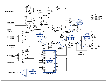 圖8中比較器(IC3)采用單電源供電、地電位檢測以及僅10ns傳輸延遲。DAC (IC4)為雙通道器件,一方麵用於脈衝高度測量,另一方麵驅動LCD對比度控製(如圖3)。注意DAC為反向驅動;電流輸出端連接在一起由經過緩衝的電壓基準驅動,基準輸入作為電壓輸出(每路帶有一個外部放大器緩衝)。