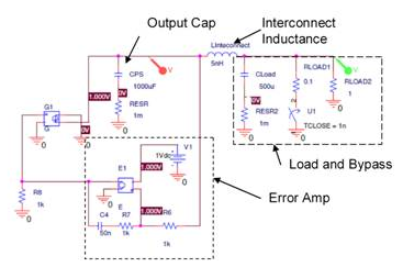 為了討論方便,圖1顯示了電源係統的P-SPICE模型。本圖由補償電路電源、調製器(G1)和輸出電容器組成。內部還包括互連電感、旁路電容負載模型、DC負載和步進負載。