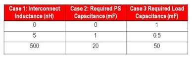 表1對舉例係統三個互連電感的要求電容器進行了比較。通過改變互連電感、計算負載旁路電容並設計電源的相應輸出級和控製環路,得到比較數據。案例1的負載和電源並列放置;案例2電源和負載之間的互連電感大小為中等。案例3中,使用線纜連接的電源的電感極高。要求旁路的多少直接與互連電感有關。