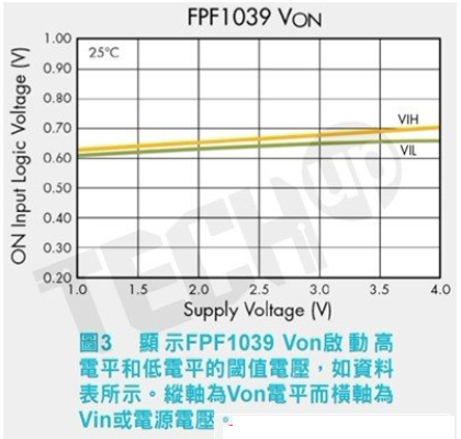 智慧型MOSFET的工作電壓Vin根據它們的製造製程而不同。對於快捷半導體的Intellimax產品線,推薦的工作電壓範圍為從0.8V至5.5V。本文中隨後將探討高壓智慧型FET。請注意輸入電壓和控製電壓間的差異是非常重要的。輸入電壓Vin是用於高側負載開關的實際額定值。在圖2中標記為ON的控製電壓電平,是開啟負載開關所需要的電壓數值。圖3取自Intellimax FPF1039資料表,顯示了開啟整合P溝道FET所需要的實際Von電壓,因為它與Vin電源電壓有關。