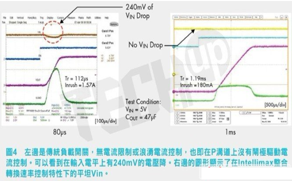 我們應該更進一步鑽研的下一代智慧型FET的特性是當開關關閉時會發生什麼?採用離散Pgoudaodechuantongfuzaikaiguankeyiwanquanguanbibinglianjieshuruzhishuchu,buguanshizhongfuzaihaishidadianrongzairuzaishuchujiaoshang。ruguozhezhongqingkuangfasheng,tongchangchujiduanshurudianpinghuixianshidianyatujiang,takenengyingxiangyupianzhidianpingxiangguanliandejingmileibishuweizhuanhuanqi(ADC)或感測器。在過去,電阻/電容(R/C)網路添加至閘極以降低開啟速度,但這會增加專案的設計時間和規模。Intellimax支援轉換速率控製特性,藉著在輸入端限製浪湧電流,可使電平中斷最小化。圖4顯示了此方案在實證研究的實驗室測試中的一個例證。注意,左邊為採用傳統P溝道方法對Vin電平的影響,右邊的則是Intellimax器件的影響。