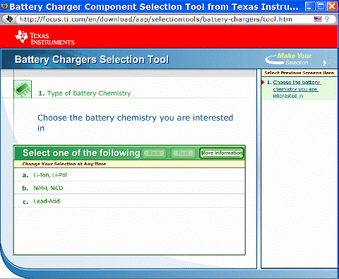 電池充電器工具使得設計人員選擇正確的充電器的過程更輕鬆。圖 3 是 TI 網站上提供的一種工具的示例。